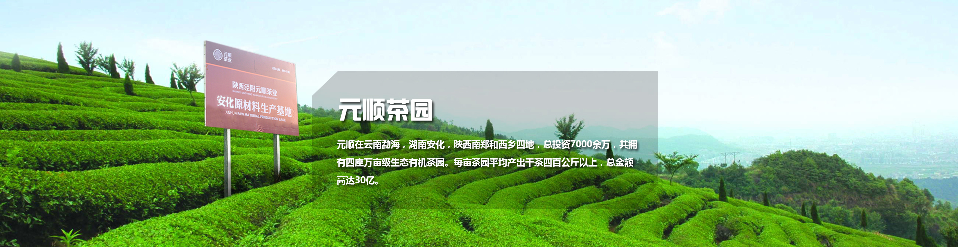 元順在云南勐海,湖南安化,陜西南鄭和西鄉四地,總投資7000余萬,共擁有四座萬畝級生態有機茶園。每畝茶園平均產出干茶四百公斤以上,總金額高達30億。這是元順茶業發展的堅實基礎,更是元順茶業用心做好茶的強大信心。